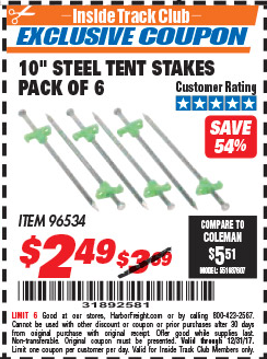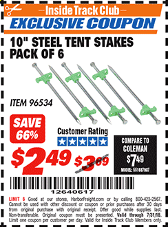 10 IN. STEEL TENT STAKES, 6-PACK Lot No. 96534 Expired: 10/31/19 - $2.99 Coupon Code: '68657525'