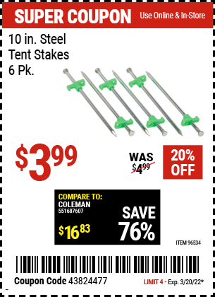 10 IN. STEEL TENT STAKES, 6-PACK Lot No. 96534 Expired: 3/20/22 - $3.99 Coupon Code: '43824477'