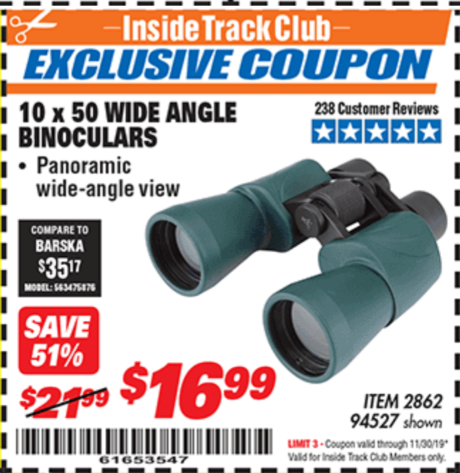 ITC 10 X 50 WIDE ANGLE BINOCULARS Lot No. 94527 Expired: 11/30/19 - $16.99 Coupon Code: '61653547'