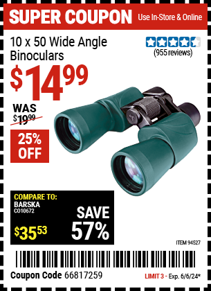 10 X 50 WIDE ANGLE BINOCULARS Lot No. 94527 Expired: 2/23/25 - $14.99 Coupon Code: '75983224'