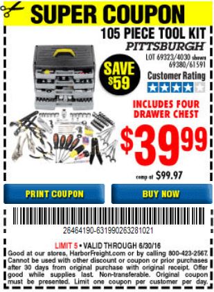 105 PIECE TOOL KIT WITH 4-DRAWER CHEST Lot No. 69323/69380/61591 Expired: 6/30/16 - $39.99 Coupon Code: '26464190'