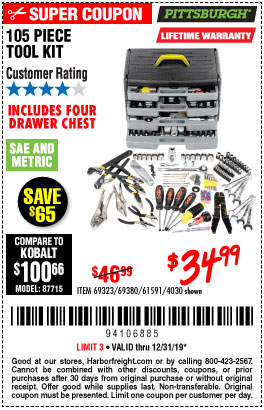 105 PIECE TOOL KIT WITH 4-DRAWER CHEST Lot No. 69323/69380/61591 Expired: 12/31/19 - $34.99 Coupon Code: '94106885'
