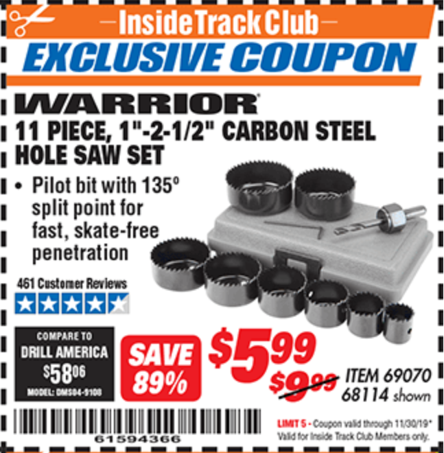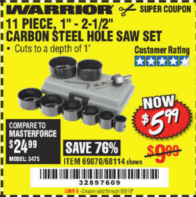 11 PIECE 1"-2-1/2" CARBON STEEL HOLE SAW SET Lot No. 69070/68114 Expired: 9/3/19 - $5.99 Coupon Code: '32897609'