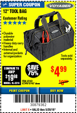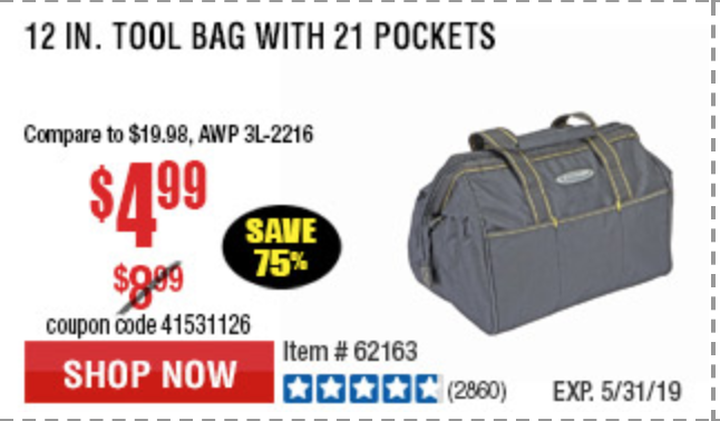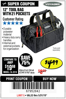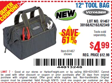 12" TOOL BAG Lot No. 61467/62163/62349 Expired: 5/31/19 - $4.99 Coupon Code: '67952842'