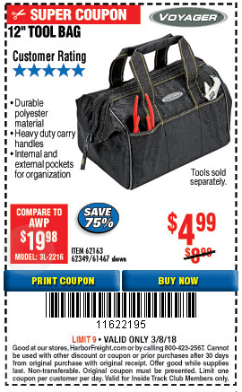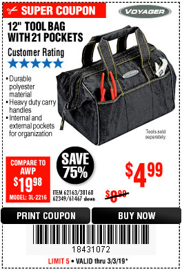 12" TOOL BAG Lot No. 61467/62163/62349 Expired: 3/3/19 - $4.99 Coupon Code: '18431072'