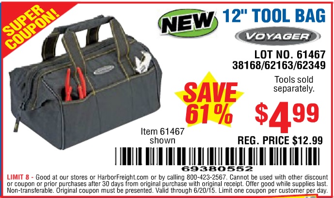 12" TOOL BAG Lot No. 61467/62163/62349 Expired: 6/11/15 - $4.99 Coupon Code: '32810216'