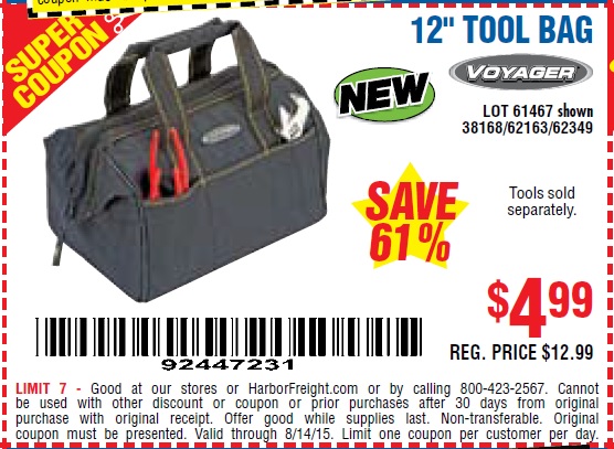12" TOOL BAG Lot No. 61467/62163/62349 Expired: 9/1/15 - $4.99 Coupon Code: '41770823'