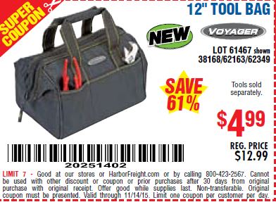 12" TOOL BAG Lot No. 61467/62163/62349 Expired: 11/14/15 - $4.99 Coupon Code: '20251402'