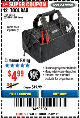 12" TOOL BAG Lot No. 61467/62163/62349 Expired: 8/31/17 - $4.99 Coupon Code: '53880899'