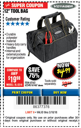 12" TOOL BAG Lot No. 61467/62163/62349 Expired: 3/18/18 - $4.99 Coupon Code: '86377376'
