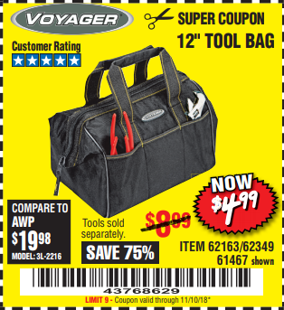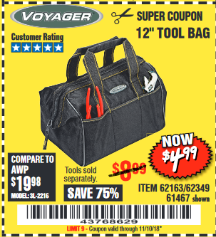 12" TOOL BAG Lot No. 61467/62163/62349 Expired: 11/10/18 - $4.99 Coupon Code: '43768629'