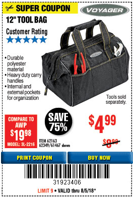 12" TOOL BAG Lot No. 61467/62163/62349 Expired: 8/5/18 - $4.99 Coupon Code: '31923406'