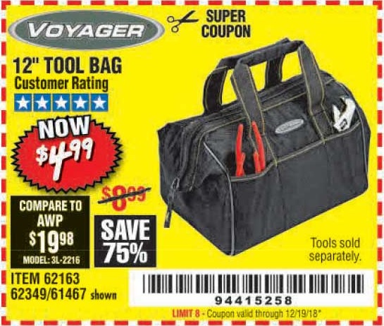 12" TOOL BAG Lot No. 61467/62163/62349 Expired: 12/19/18 - $4.99 Coupon Code: '94415258'