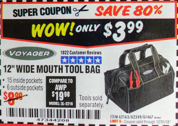 12" TOOL BAG Lot No. 61467/62163/62349 Expired: 12/31/18 - $3.99 Coupon Code: '47344208'