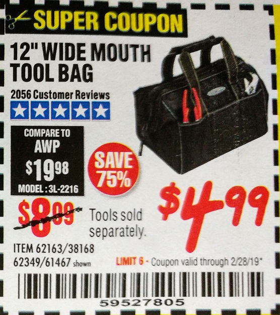 12" TOOL BAG Lot No. 61467/62163/62349 Expired: 2/28/19 - $4.99 Coupon Code: '59527805'