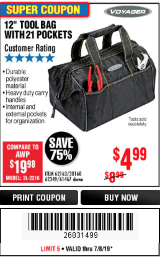 12" TOOL BAG Lot No. 61467/62163/62349 Expired: 7/7/19 - $4.99 Coupon Code: '26831499'