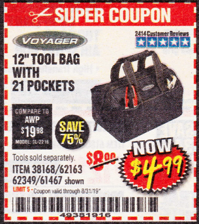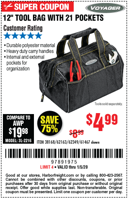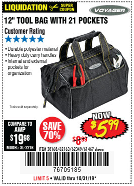 12" TOOL BAG Lot No. 61467/62163/62349 Expired: 1/5/20 - $4.99 Coupon Code: '97891975'