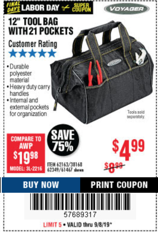 12" TOOL BAG Lot No. 61467/62163/62349 Expired: 8/31/19 - $4.99 Coupon Code: '49381916'