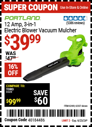 12 AMP, 3-IN-1 ELECTRIC BLOWER VACUUM MULCHER Lot No. 62469/62337 Expired: 6/23/24 - $39.99 Coupon Code: '40184486'