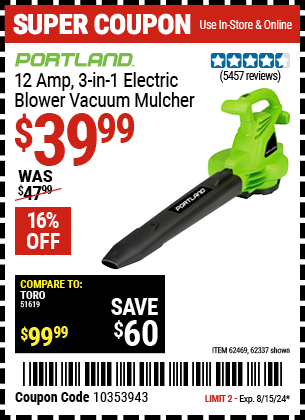 12 AMP, 3-IN-1 ELECTRIC BLOWER VACUUM MULCHER Lot No. 62469/62337 Expired: 8/15/24 - $39.99 Coupon Code: '10353943'