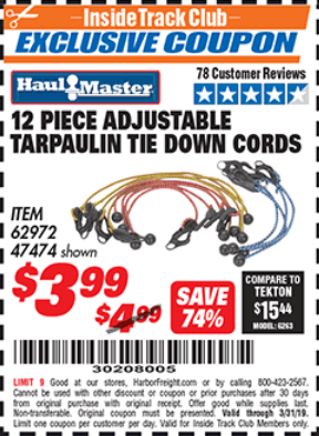 ITC 12 PIECE ADJUSTABLE TARPAULIN TIE DOWN CORDS Lot No. 62972/47474 Expired: 3/31/19 - $3.99 Coupon Code: '30208005'