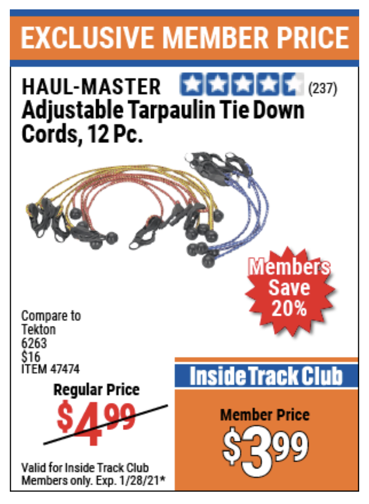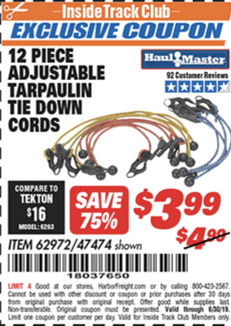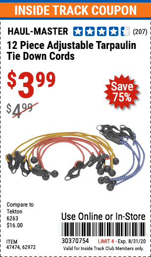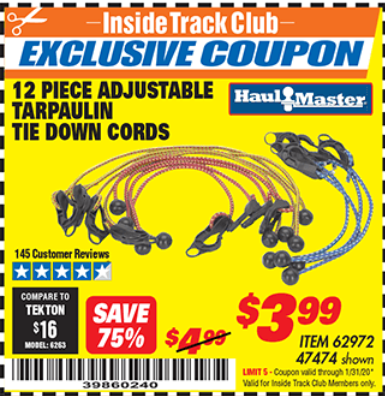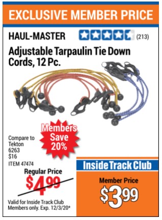 ITC 12 PIECE ADJUSTABLE TARPAULIN TIE DOWN CORDS Lot No. 62972/47474 Expired: 12/3/20 - $3.99 Coupon Code: 'n/a'