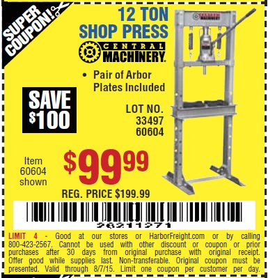 12 TON SHOP PRESS Lot No. 33497/60604 Expired: 8/7/15 - $99.99 Coupon Code: '26211271'