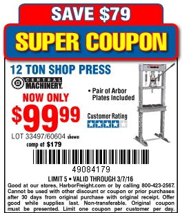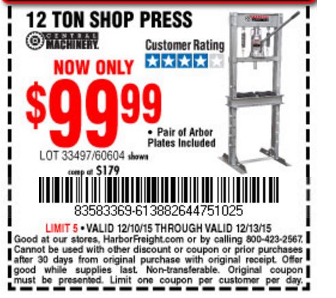 12 TON SHOP PRESS Lot No. 33497/60604 Expired: 10/12/15 - $99.99 Coupon Code: '41063434'