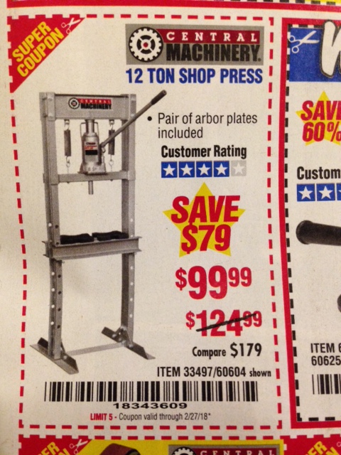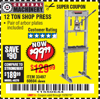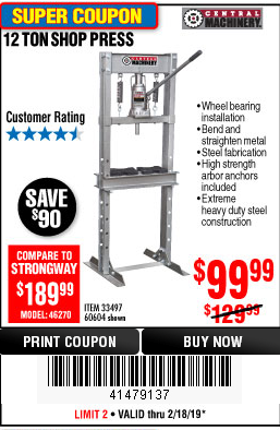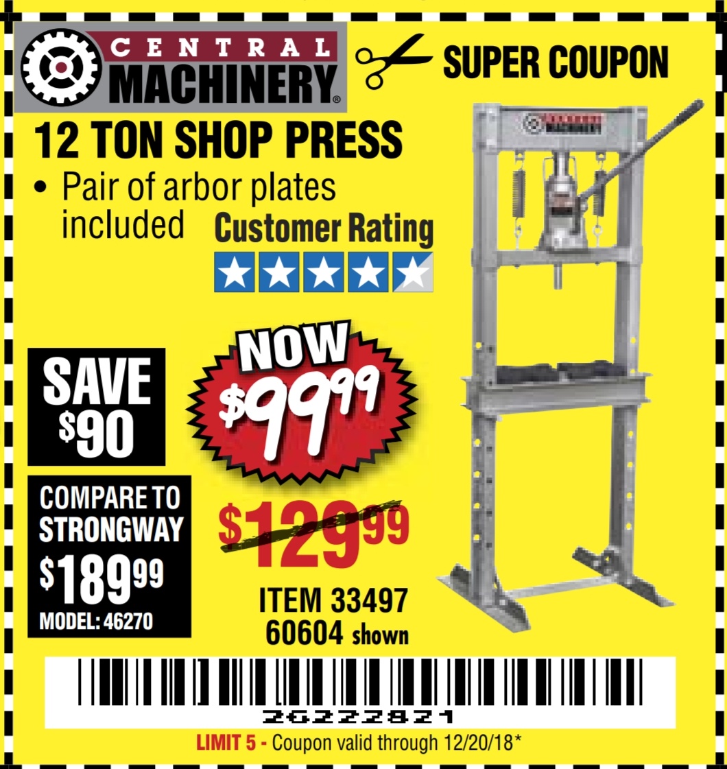 12 TON SHOP PRESS Lot No. 33497/60604 Expired: 2/18/19 - $99.99 Coupon Code: '41479137'