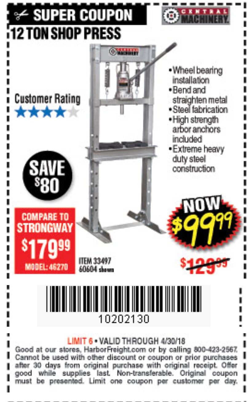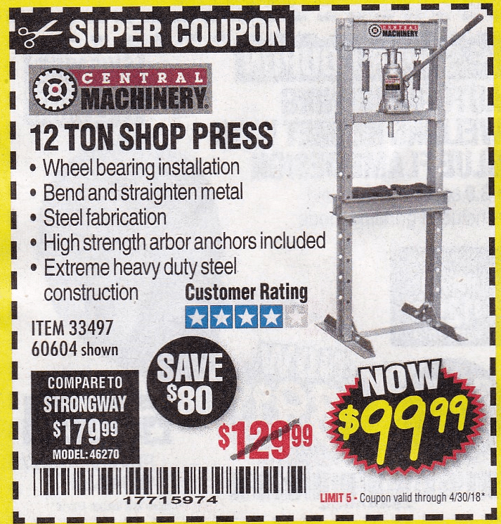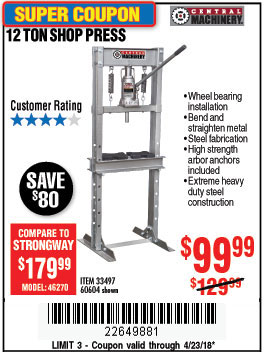 12 TON SHOP PRESS Lot No. 33497/60604 Expired: 4/30/18 - $99.99 Coupon Code: '17715974'