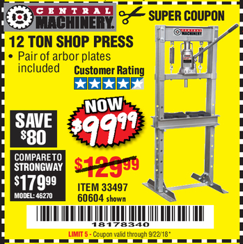 12 TON SHOP PRESS Lot No. 33497/60604 Expired: 9/22/18 - $99.99 Coupon Code: '18178340'