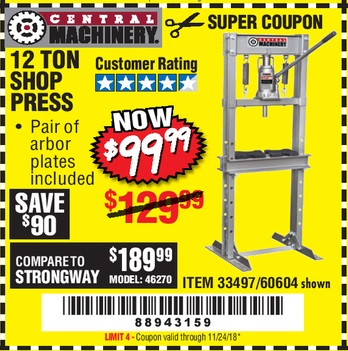 12 TON SHOP PRESS Lot No. 33497/60604 Expired: 11/24/18 - $99.99 Coupon Code: '88943159'