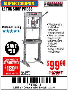12 TON SHOP PRESS Lot No. 33497/60604 Expired: 1/21/19 - $99.99 Coupon Code: '37448244'