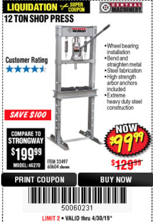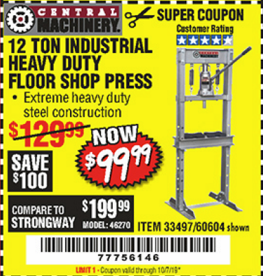 12 TON SHOP PRESS Lot No. 33497/60604 Expired: 6/15/19 - $99.99 Coupon Code: '44481833'