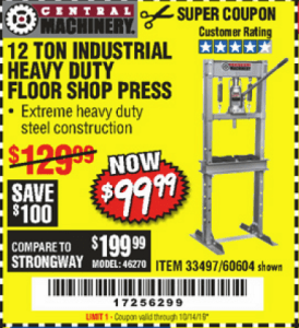 12 TON SHOP PRESS Lot No. 33497/60604 Expired: 10/14/19 - $99.99 Coupon Code: '17256299'