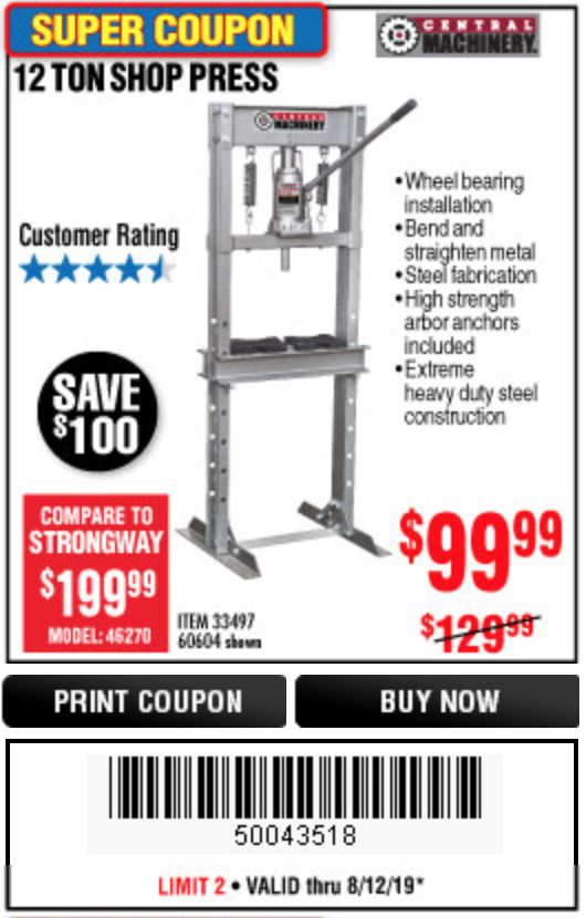12 TON SHOP PRESS Lot No. 33497/60604 Expired: 8/12/19 - $99.99 Coupon Code: '50043518'