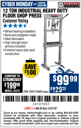 12 TON SHOP PRESS Lot No. 33497/60604 Expired: 12/2/19 - $99.99 Coupon Code: '34187897'