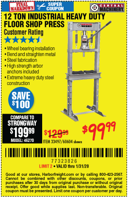 12 TON SHOP PRESS Lot No. 33497/60604 Expired: 1/31/20 - $99.99 Coupon Code: '77323826'