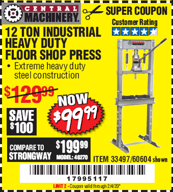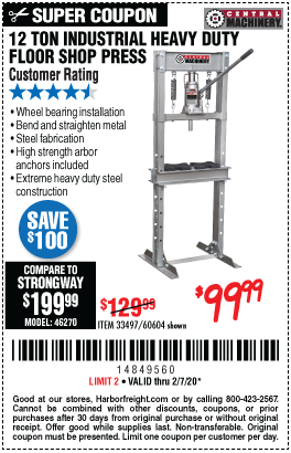 12 TON SHOP PRESS Lot No. 33497/60604 Expired: 2/7/20 - $99.99 Coupon Code: '14849560'