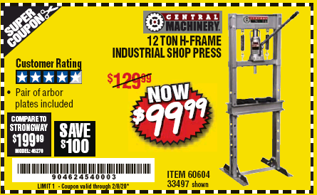 12 TON SHOP PRESS Lot No. 33497/60604 Expired: 2/8/20 - $99.99 Coupon Code: '90462454'
