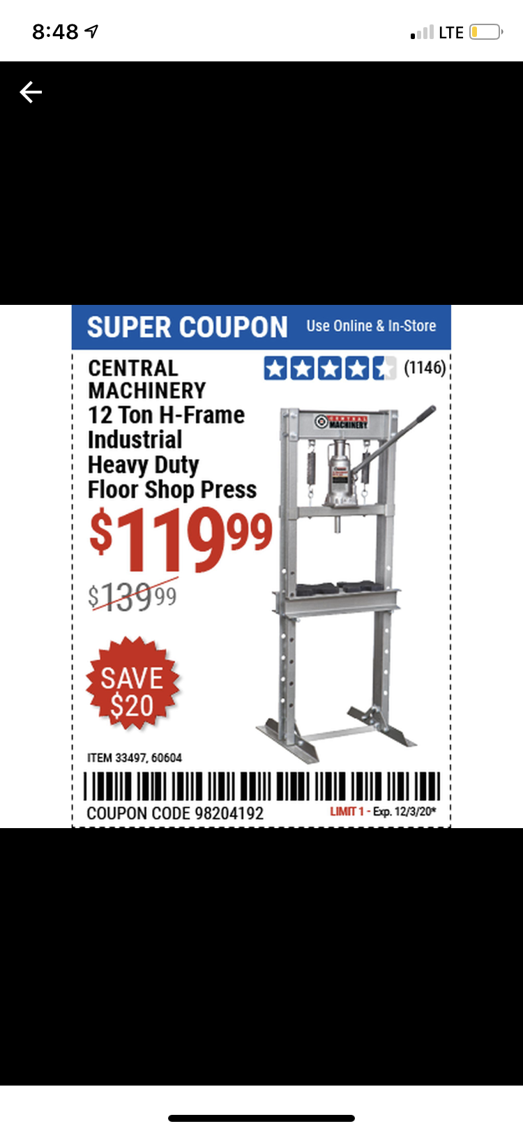 12 TON SHOP PRESS Lot No. 33497/60604 Expired: 12/3/20 - $119.99 Coupon Code: '98204192'