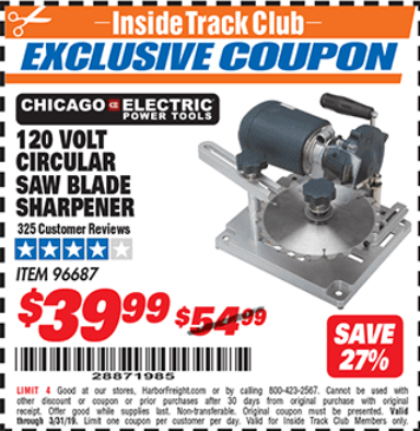 ITC 120 VOLT CIRCULAR SAW BLADE SHARPENER Lot No. 96687 Expired: 1/31/19 - $39.99 Coupon Code: '50254485'
