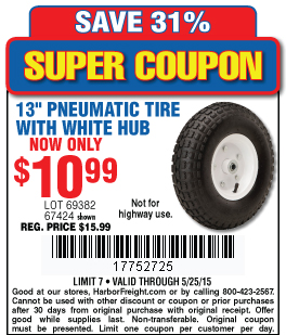 13" PNEUMATIC TIRE WITH WHITE HUB Lot No. 69382/67424 Expired: 5/25/15 - $10.99 Coupon Code: '17752725'