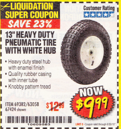 13" PNEUMATIC TIRE WITH WHITE HUB Lot No. 69382/67424 Expired: 6/30/18 - $9.99 Coupon Code: '10609583'