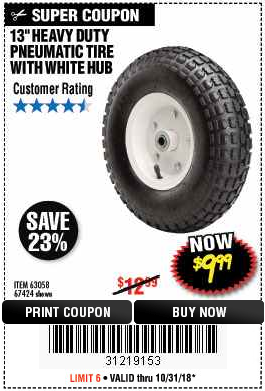 13" PNEUMATIC TIRE WITH WHITE HUB Lot No. 69382/67424 Expired: 10/31/18 - $9.99 Coupon Code: '31219153'