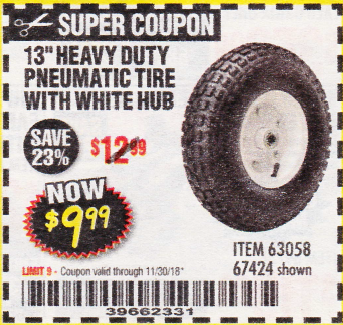 13" PNEUMATIC TIRE WITH WHITE HUB Lot No. 69382/67424 Expired: 11/30/18 - $9.99 Coupon Code: '39662331'