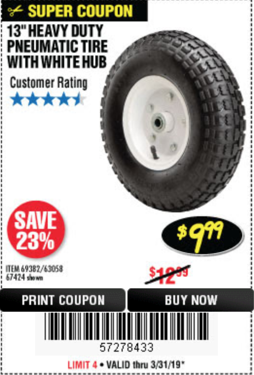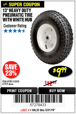 13" PNEUMATIC TIRE WITH WHITE HUB Lot No. 69382/67424 Expired: 3/31/19 - $9.99 Coupon Code: '57278433'
