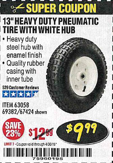 13" PNEUMATIC TIRE WITH WHITE HUB Lot No. 69382/67424 Expired: 4/30/19 - $9.99 Coupon Code: '75960195'