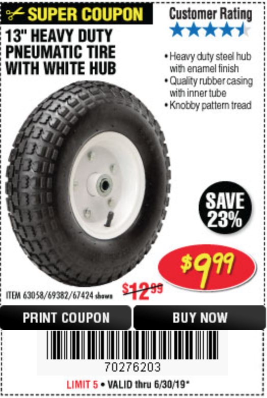13" PNEUMATIC TIRE WITH WHITE HUB Lot No. 69382/67424 Expired: 6/30/19 - $9.99 Coupon Code: '70276203'