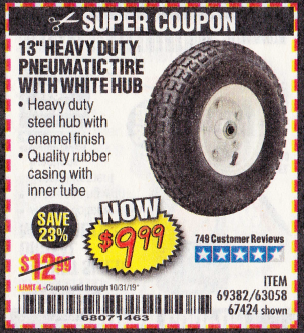 Harbor Freight Coupon 13" HEAVY DUTY PNEUMATIC TIRE WITH WHITE HUB Lot No. 69382 Expired: 10/31/19 - $9.99 13" HEAVY DUTY PNEUMATIC TIRE WITH WHITE HUB Lot No. 69382 Expired: 10/31/19 - $9.99 Coupon Code: '68071463'